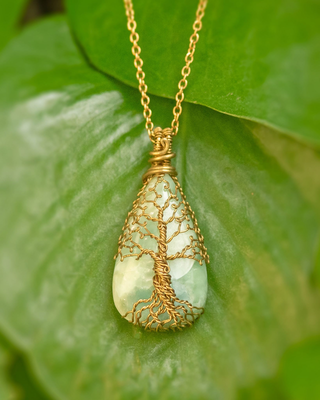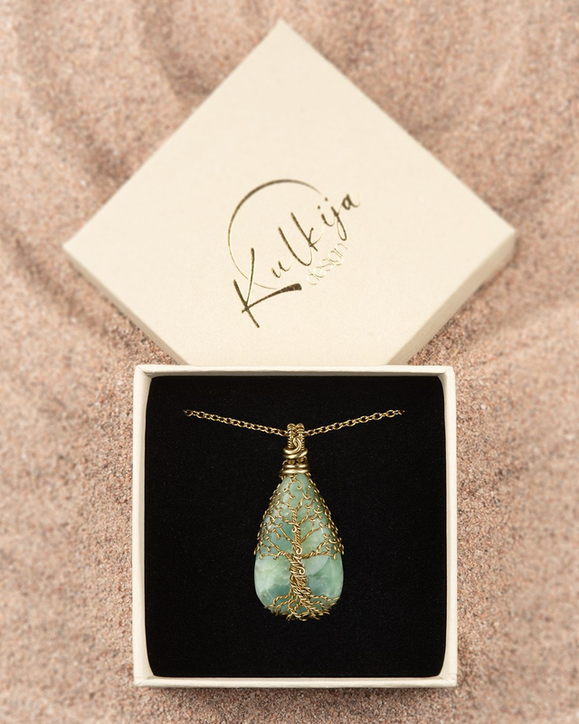 Materiaalit: hemimorfiitti, messinki. Kaulaketju: kullattu ruostumaton teräs