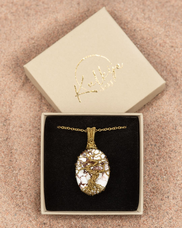 Materiaalit: villihevosjaspis, messinki. Kaulaketju: kullattu ruostumaton teräs.